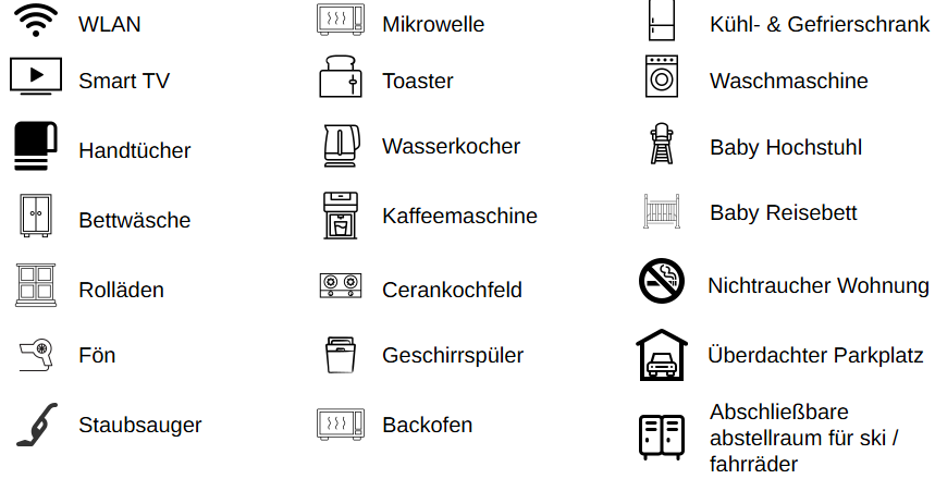 Die Küche ist komfortabel ausgestattet mit Geschirrspüler, Backofen, Kühlschrank mit Gefrierfach, Mikrowelle, Kaffeemaschine, Wasserkocher und Toaster. Waschmaschine und Trockner stehen den Gästen zur Verfügung. Das Badezimmer verfügt über ein großes Dachfenster mit Bergblick, eine Dusche und einen Haartrockner. Bettdecken, Bettwäsche und Handtücher werden gestellt.